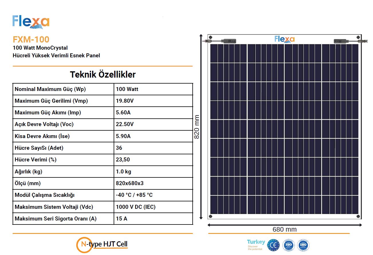 100 Watt esnek güneş paneli; Hafif, İnce, Esnek ve Yüksek Verimlidir.
