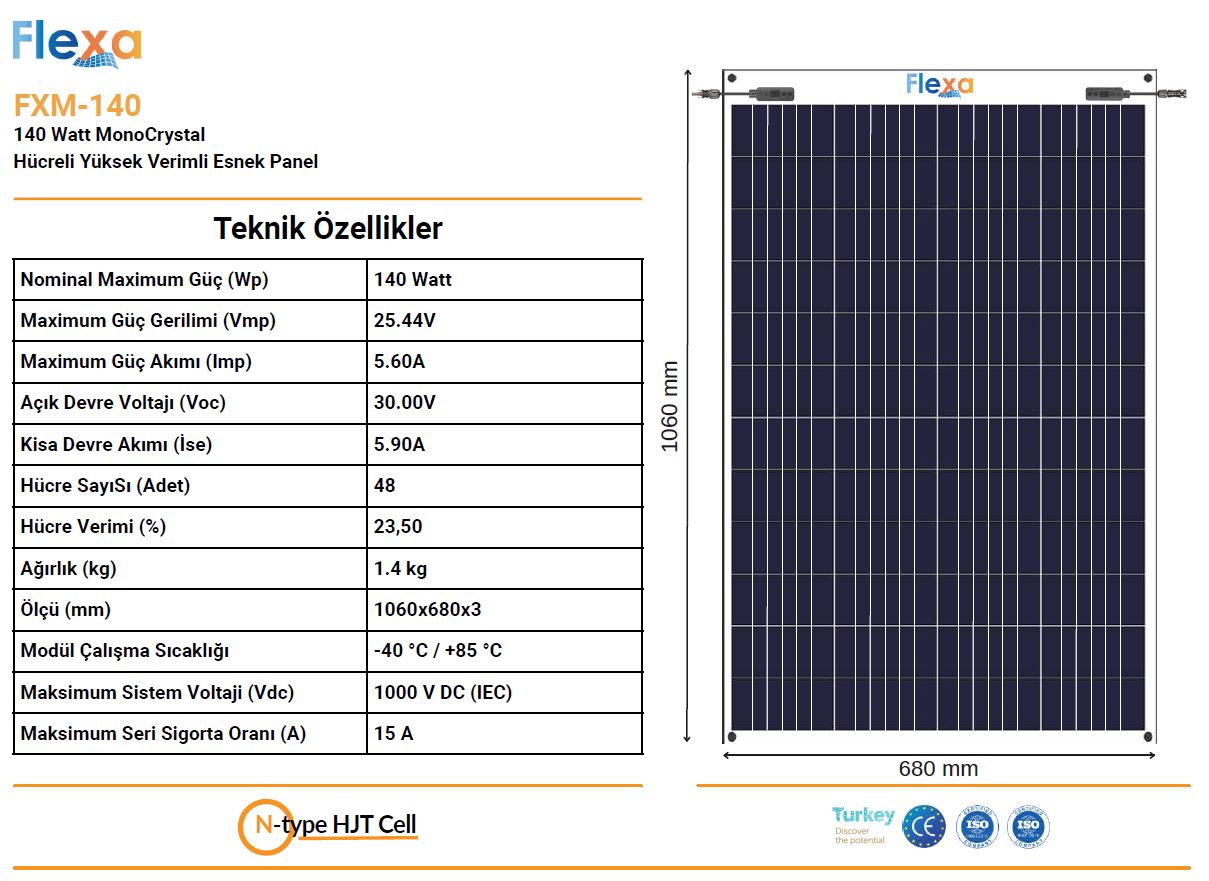 140 Watt esnek güneş paneli 1060x680x3 mm ürün ölçüleri Hafif, İnce, Esnek ve Yüksek Verimlidir.