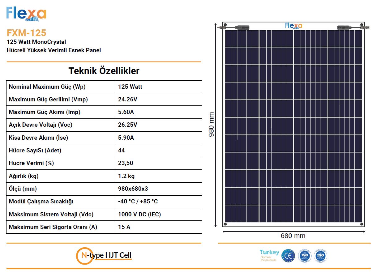 125 Watt esnek güneş paneli 980x680x3 mm Hafif, İnce, Esnek ve Yüksek Verimlidir.