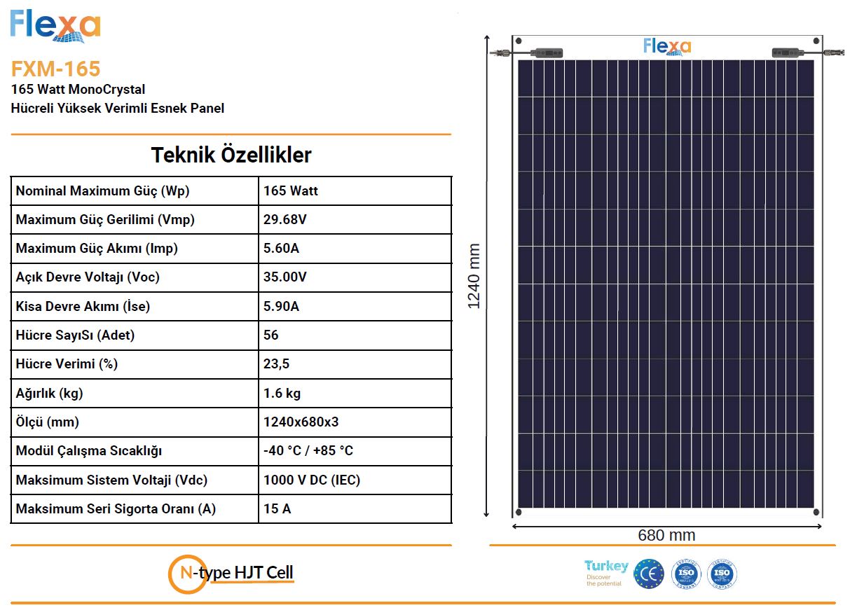 165 Watt esnek güneş paneli 1340x680x3mm Hafif, İnce, Esnek ve Yüksek Verimlidir.