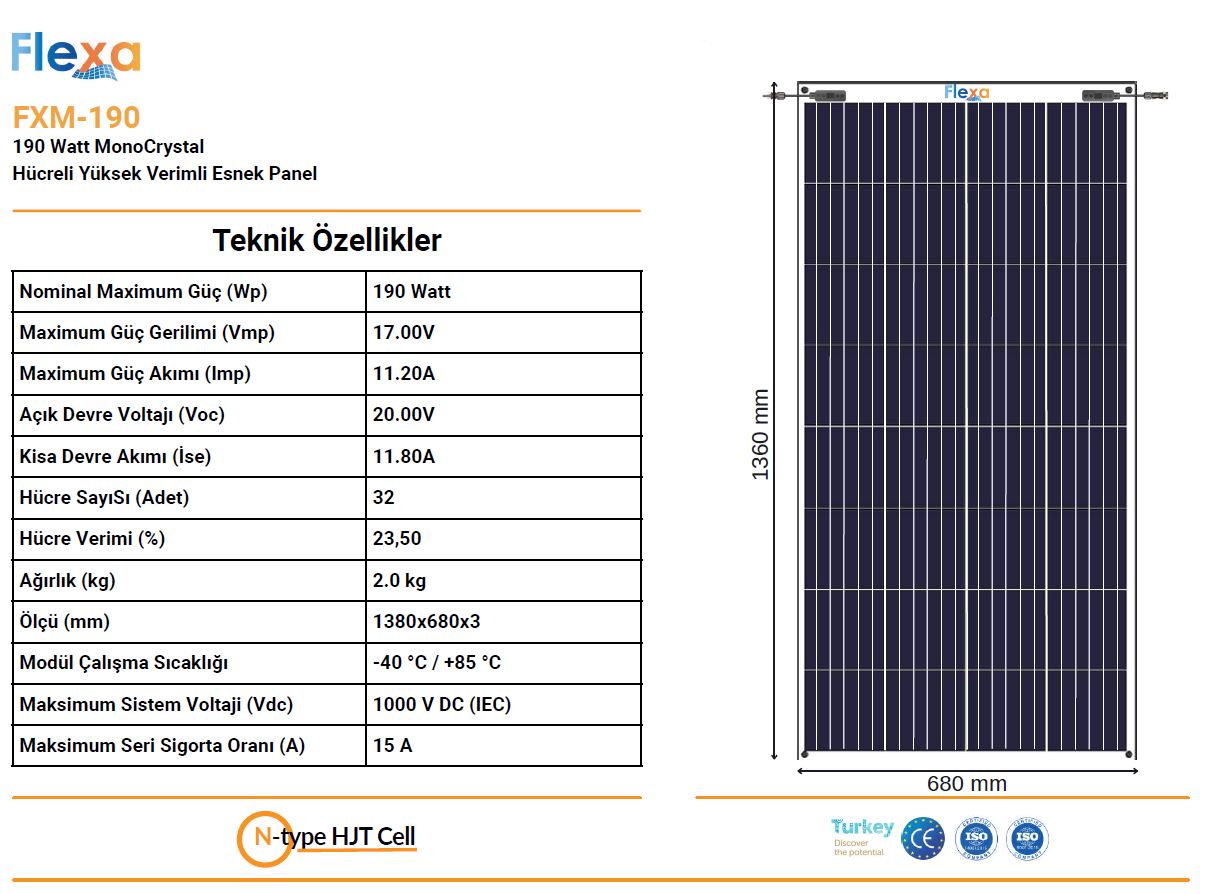190 Watt esnek güneş paneli 1360x680x3 mm Hafif, İnce, Esnek ve Yüksek Verimlidir.